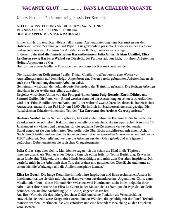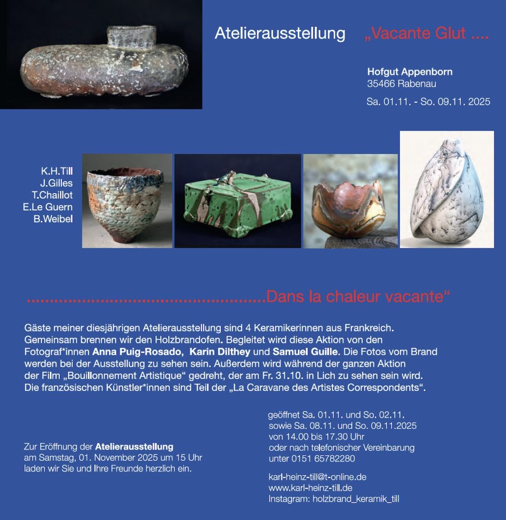 Anläßlich des 10-jährigen Bestehens des Ofens, zeigen die Werkstätten Karl Heinz Till, Karin Schweikhard u. Michael Limbeck, Sebastian Scheid u. Sigi u. Charlotte Böhmer in einer Atelierausstellung auf dem Hofgut Appenborn, 35466 Rabenau am Sa. 4.u So. 5.Nov. sowie Sa. 11. u. So. 12. Nov. 2023 jeweils von 14 – 17:30 Uhr sowie nach tel. Vereinbarung 0151 65782280 Holzbrand Arbeiten aus dem Train Kiln .